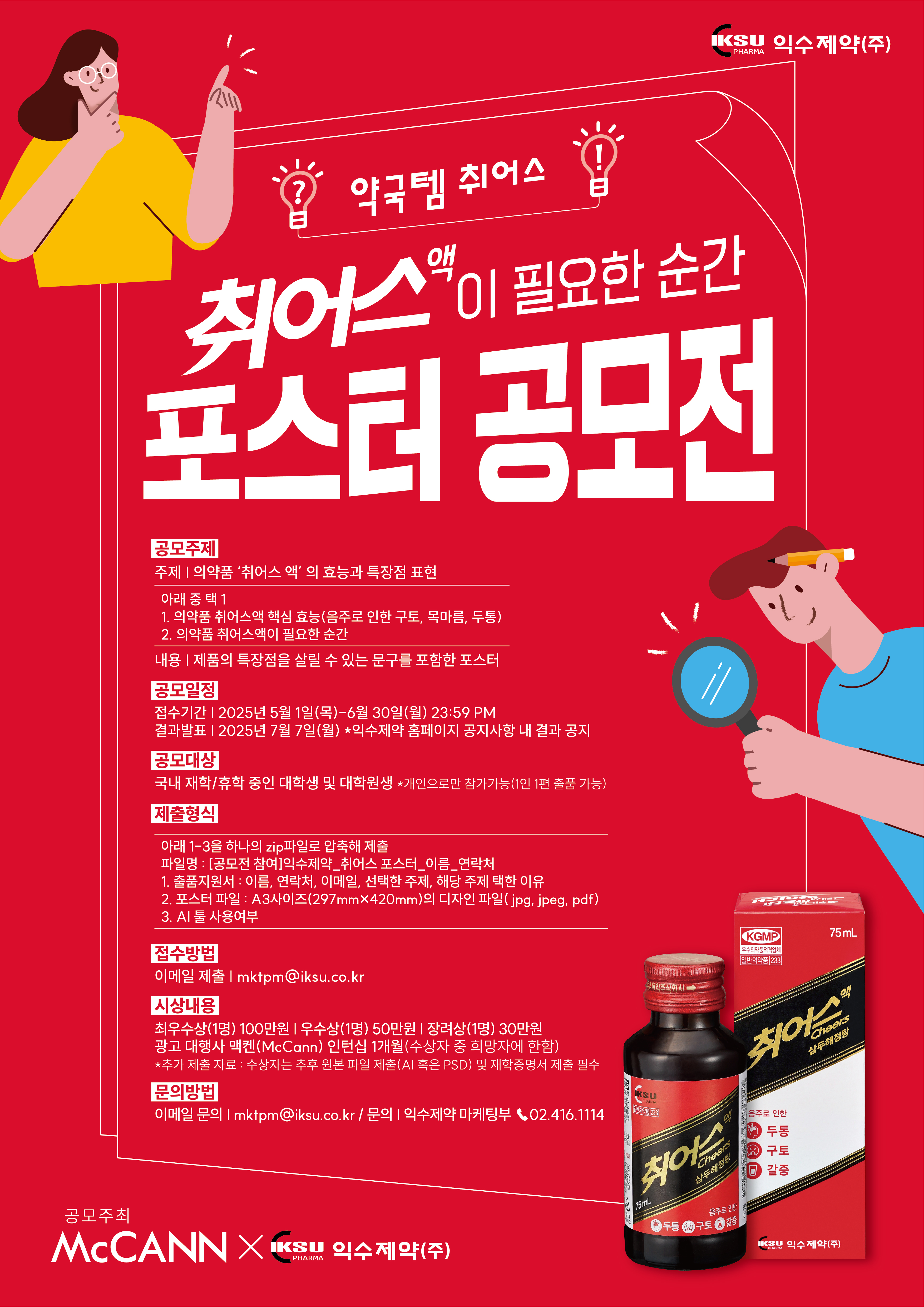 [익수제약x맥켄(McCANN)] 익수제약 약국템 '취어스액' 포스터 공모전 (~6/30)