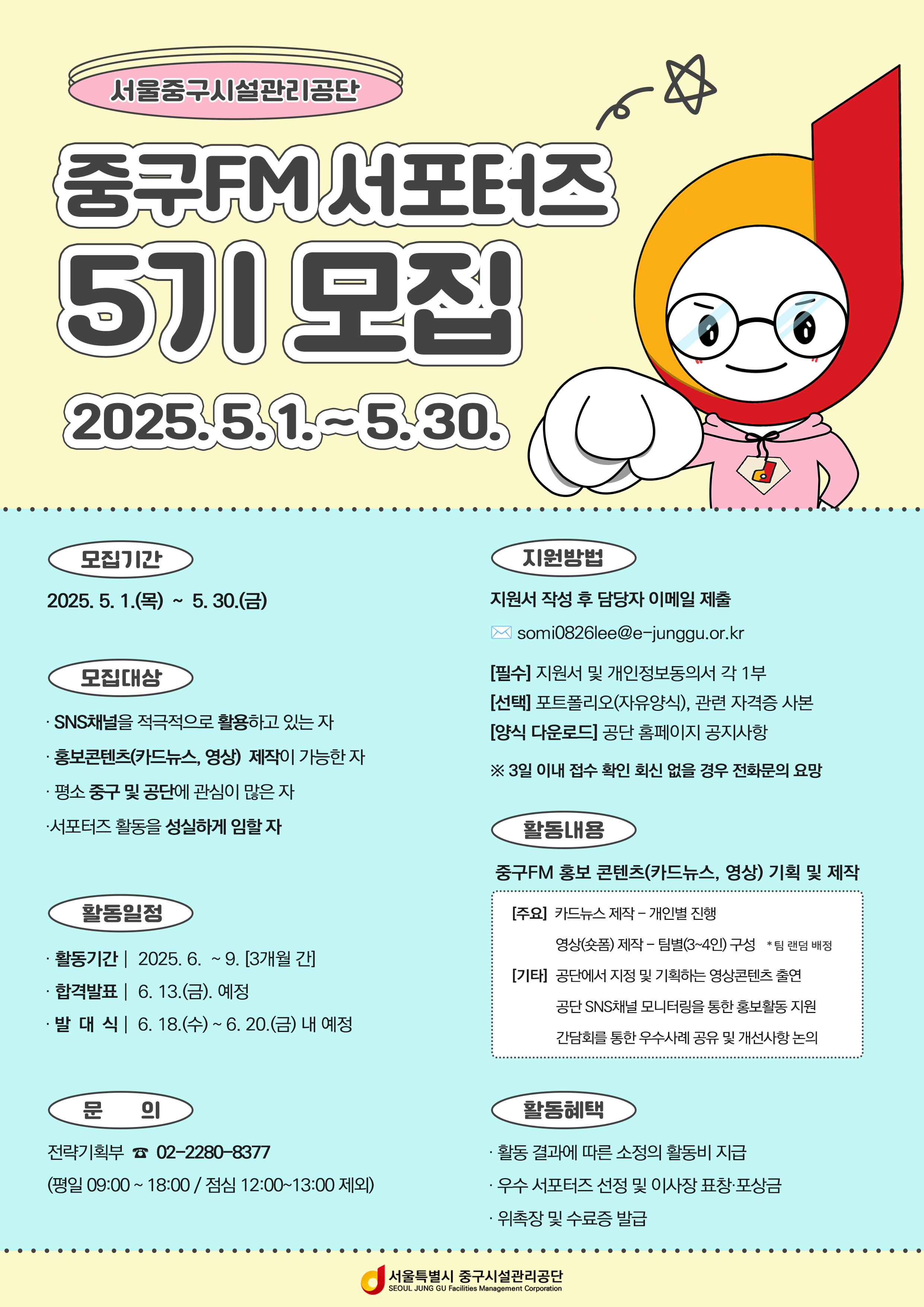 - 서울중구시설관리공단 제5기 중구FM서포터즈를 모집하오니