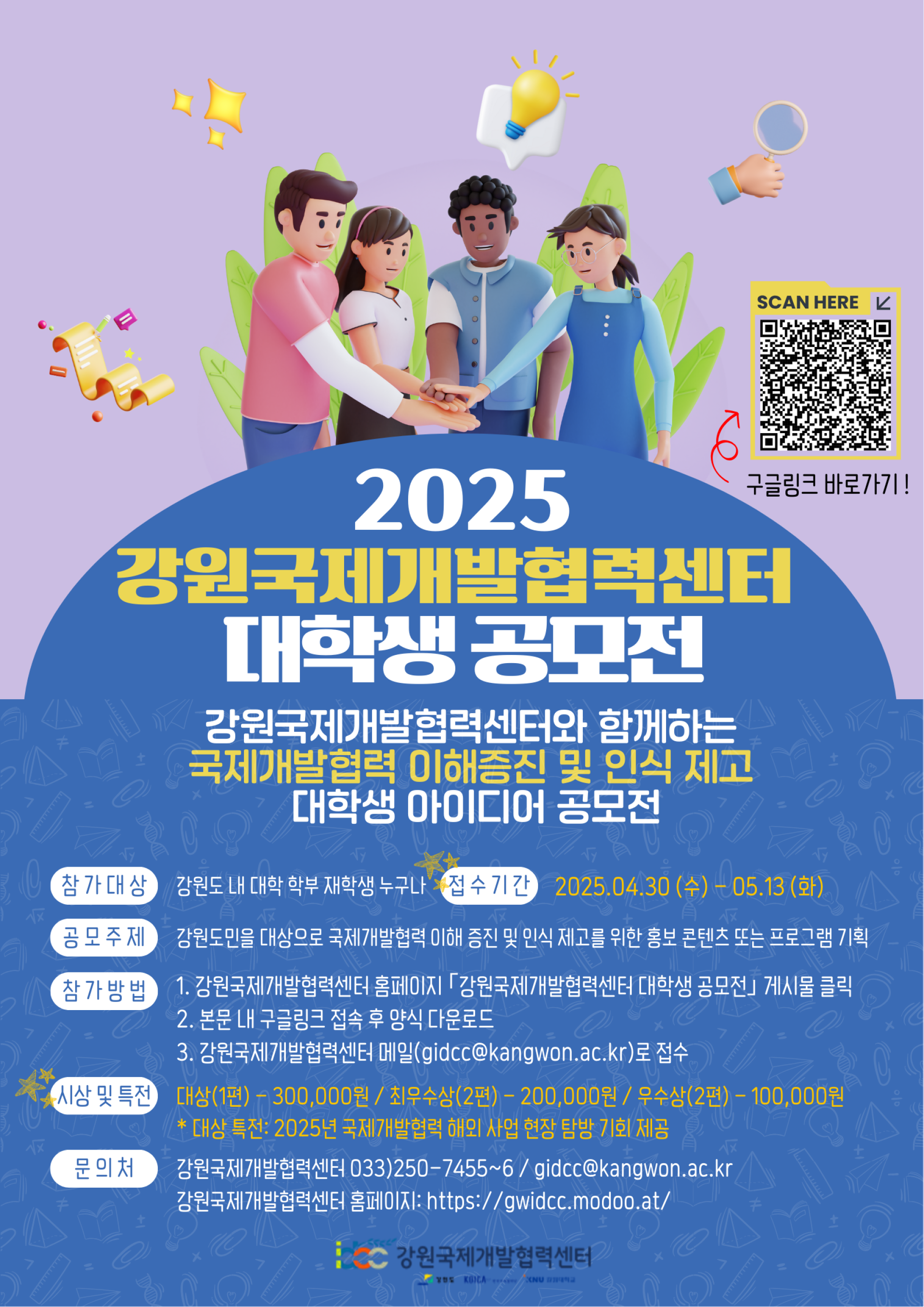 - 강원국제개발협력센터에서 2025년도 [강원국제개발협력센터 대학생 공모전]을 시행합니다.
