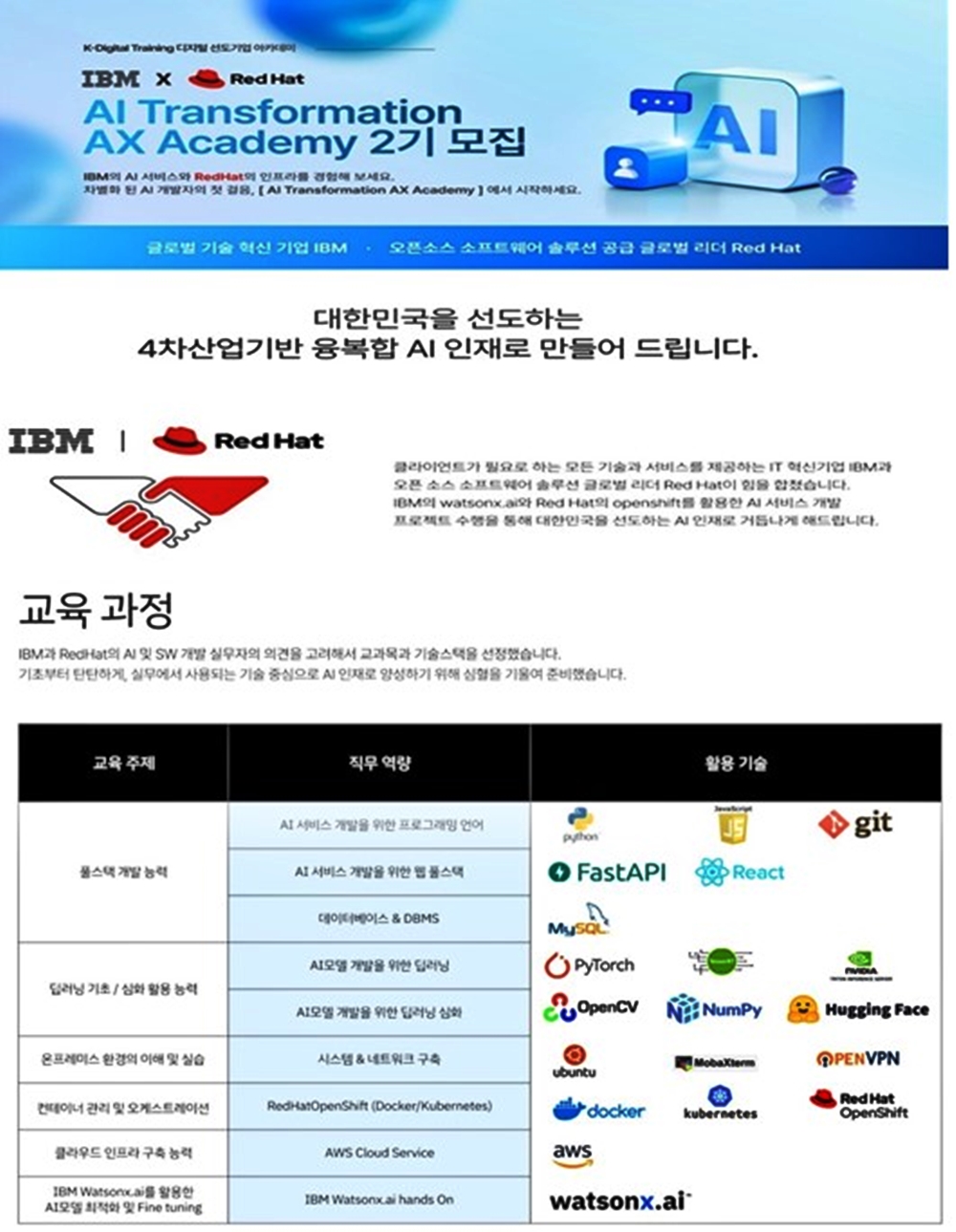 | 시상내역 | - 교육비전액지원 - 일정금액의 지원금 제공 - 기업취업연계 - IBM x Red Hat 현직 엔지니어 멘토링 - 최적의 학습 환경 제공(실시간질의응답체계구축,실급실및회의실상시개방,우수프로젝트포상,온라인수강지원) - IBM의 AI 솔루션과 Red Hat 인프라 실습 자원 제공 - 우수훈련생 한국 레드햇 채용 우대 - IBM x Red Hat Partner |