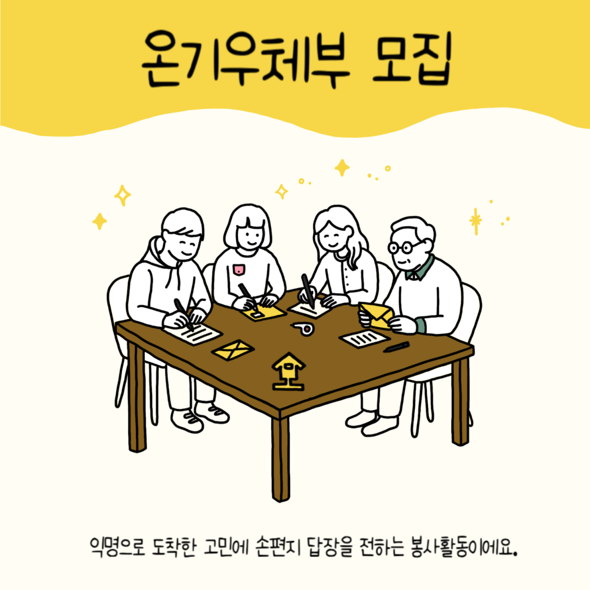 용기내어 전해주신 고민에 진심을 담아 듣고, 손편지 답장을 함께 전해주실 따뜻한 분들을 모집하고 있어요!