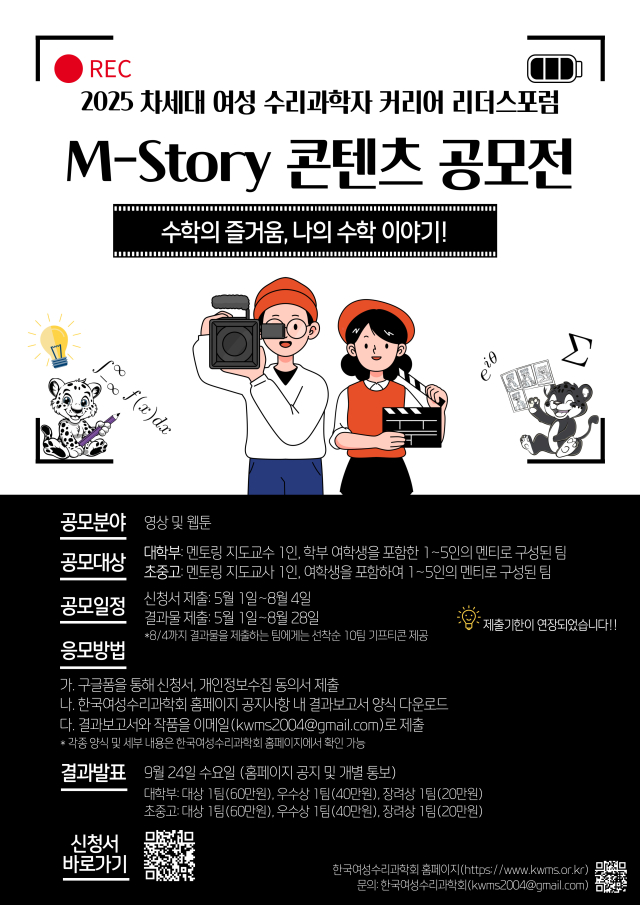 - 한국여성수리과학회는 한국여성과학기술단체총연합회의 지원을 받아 <2025 차세대 여성수리과학 전공자 리더스 포럼>을