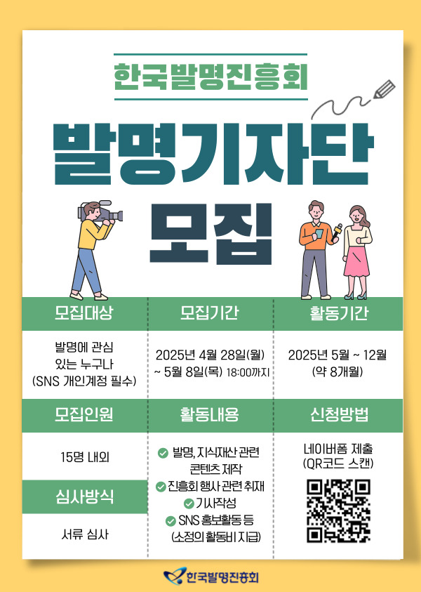 - 한국발명진흥회는 발명과 지식재산의 가치를 널리 알리고, 창의적인 콘텐츠로 함께 소통할 기자단을 모집하오니 많은 지원 바랍니다.