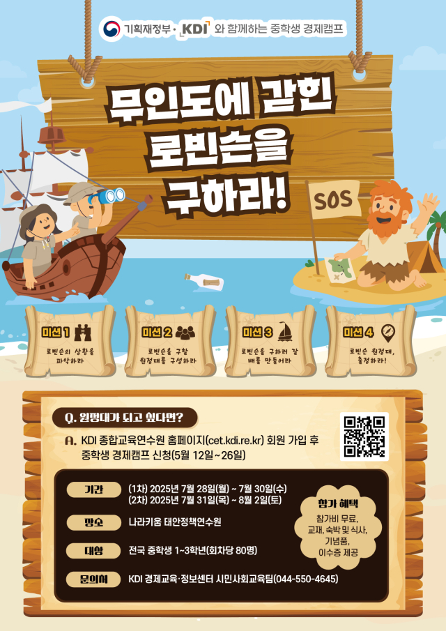 - 기획재정부와 KDI는 중학생들의 경제 학습에 대한 동기를 부여하고 학교 경제교육을 보완하고자 올 여름 경제캠프 '무인도에 갇힌 로빈슨을 구하라'를 개최합니다. 주어진 미션을 풀면서 재미 있게 경제 개념을 익히고 싶은 많은 중학생 분들의 참여 부탁드립니다.