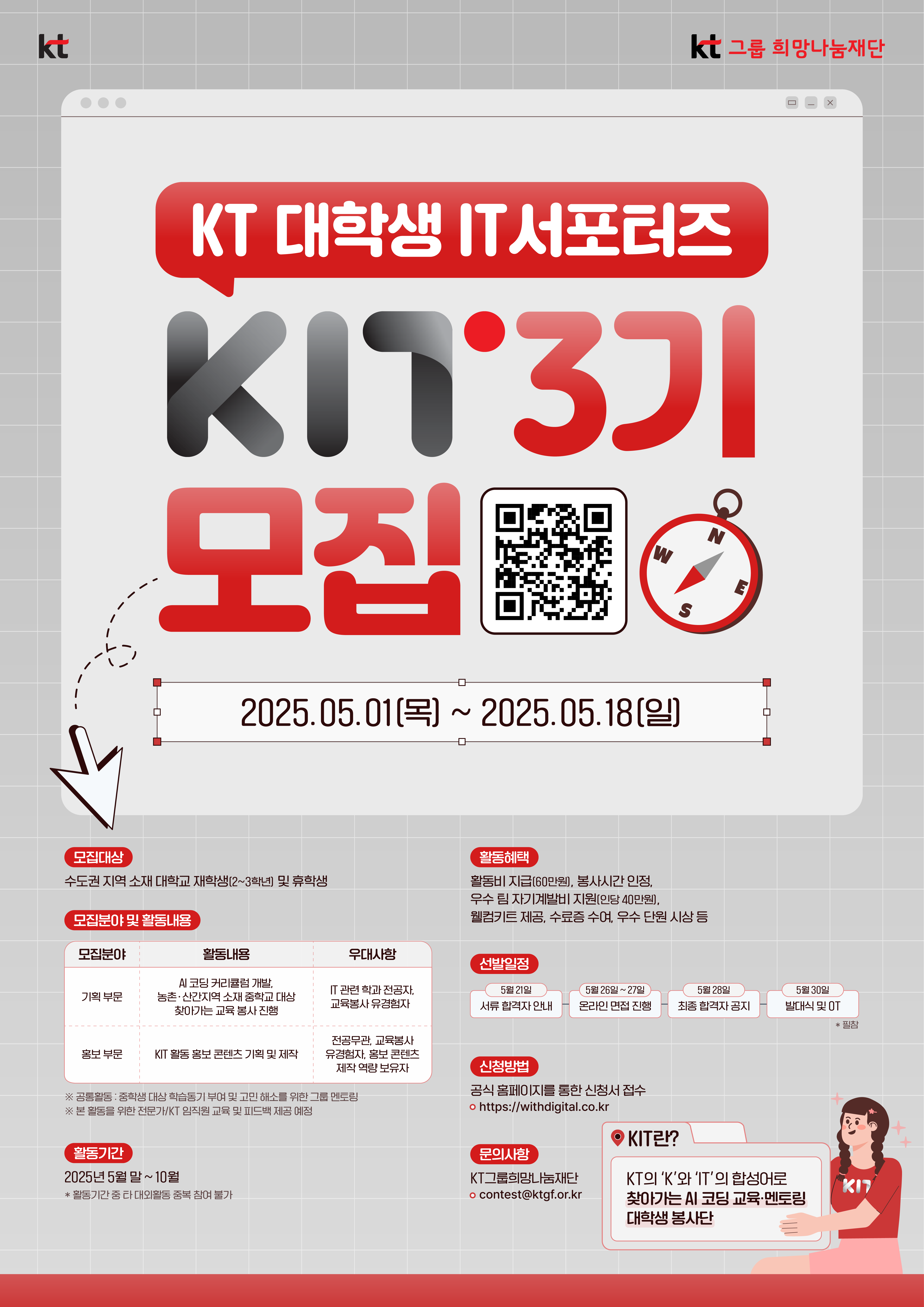 - KT 대학생 IT서포터즈 ‘KIT’는 KT의 ‘K’와 ‘IT’의 합성어로 찾아가는 AI 코딩 교육·멘토링 대학생 봉사단입니다.