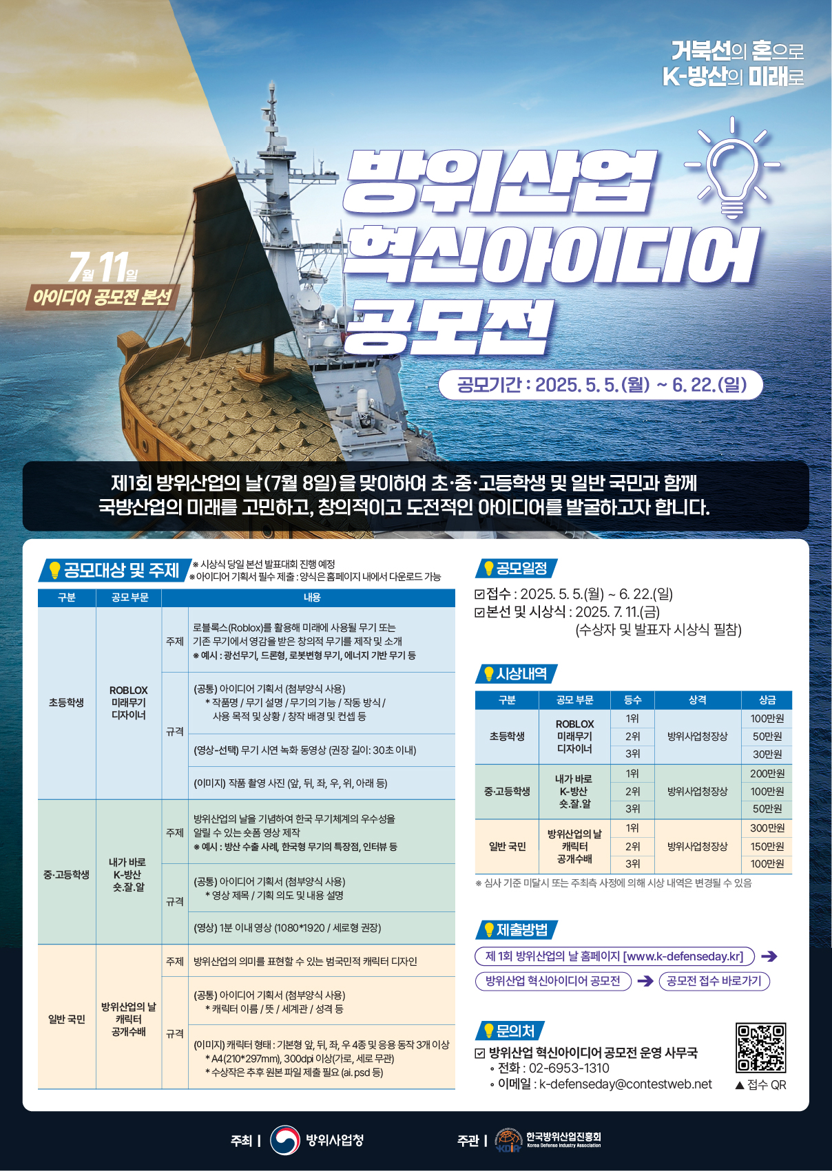 - 제1회 방위산업의 날 홈페이지 (www.k-defenseday.kr) ▶ 방위산업 혁신아이디어 공모전 ▶공모전 접수 바로가기