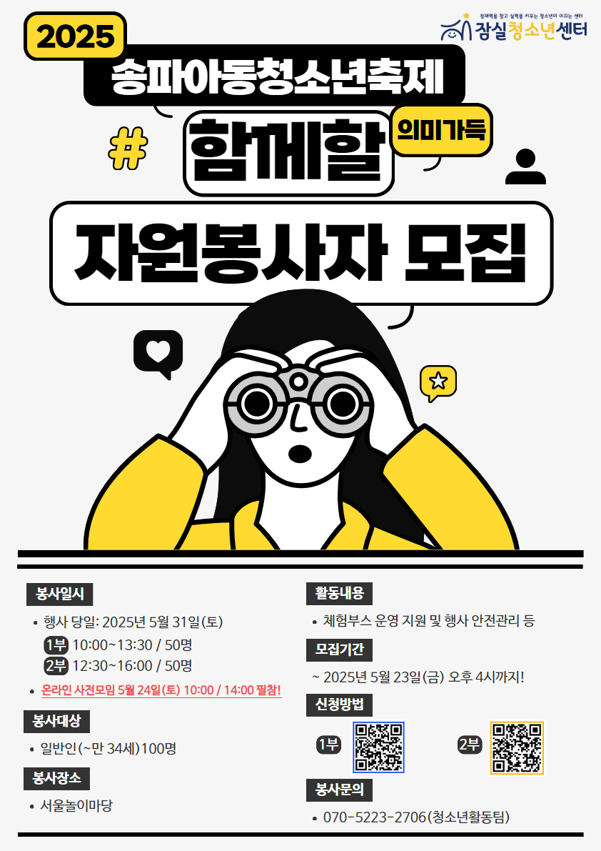 - 제 10회 송파청소년축제 체험부스 운영 지원 및 안전관리 자원봉사자를 모집합니다.