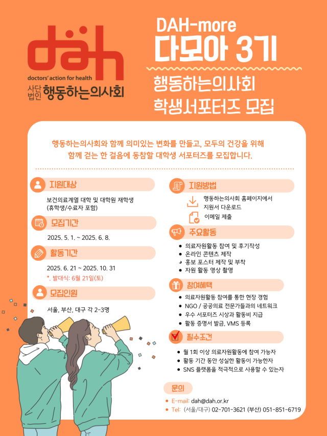 - 2025 (사)행동하는의사회 대학생 서포터즈 <다모아 3기>를 모집합니다.