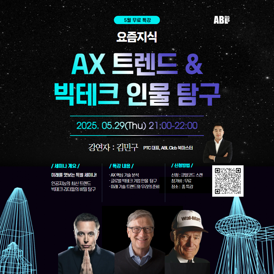 5/29 단 하루만 시행하는 무료 zoom 특강, 시야를 넓히는 기회로 AX 트렌드와 빅테크 인물 탐구에 함께 참여해보세요.