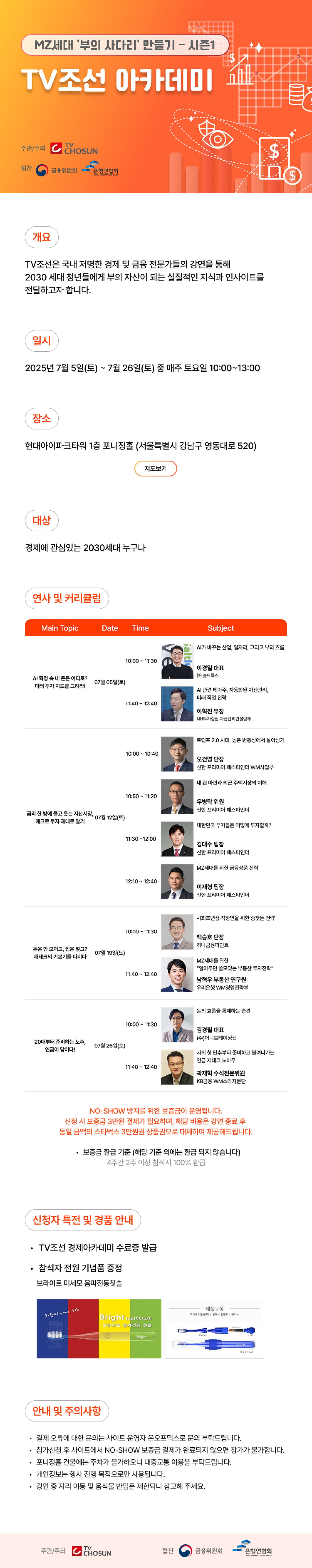 - TV조선은 국내 저명한 경제 및 금융 전문가들의 강연을 통해 2030 세대 청년들에게 부의 자산이 되는 실질적인 지식과 인사이트를 전달하고자 합니다.