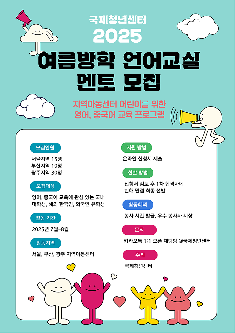 2025 여름방학 지역아동센터 영어/중국어 언어교실 봉사자 모집(서울, 부산, 광주)