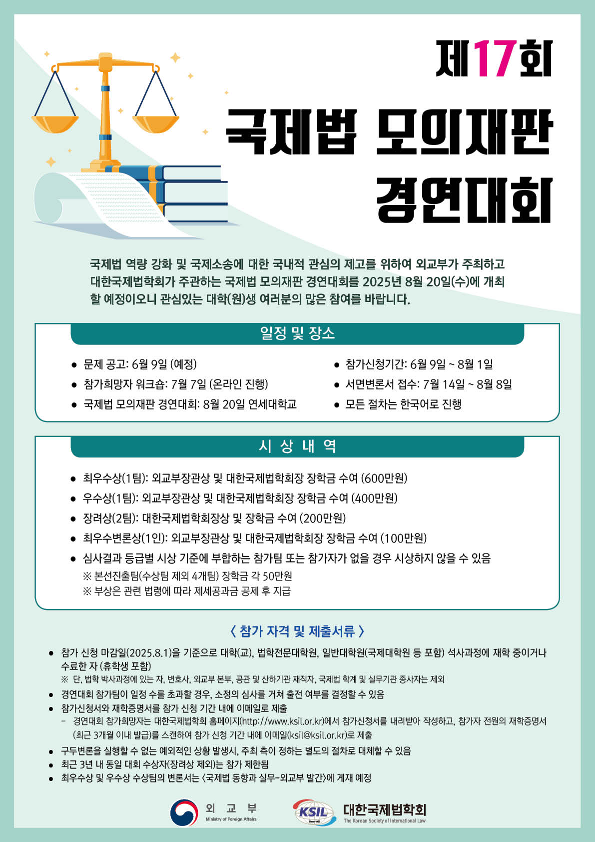 국제법 모의재판 경연대회를 2025년 8월 20일(수)에 개최할 예정이오니 관심있는 대학(원)생 여러분의 많은 참여를 바랍니다.