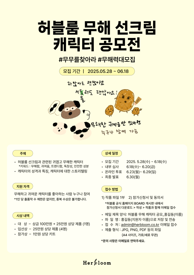 - 기능성 비건 뷰티 브랜드 허블룸의 무해하고 안전한 성분의 선크림과 관련된 캐릭터를 찾는 공모전