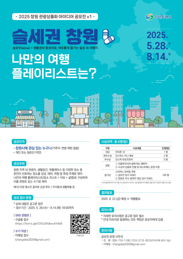 「슬세권 창원 - 나만의 여행 플레이리스트는?」 창원 관광상품화 아이디어 공모전을 개최하오니, 관심 있는 분들의 많은 참여 바랍니다.