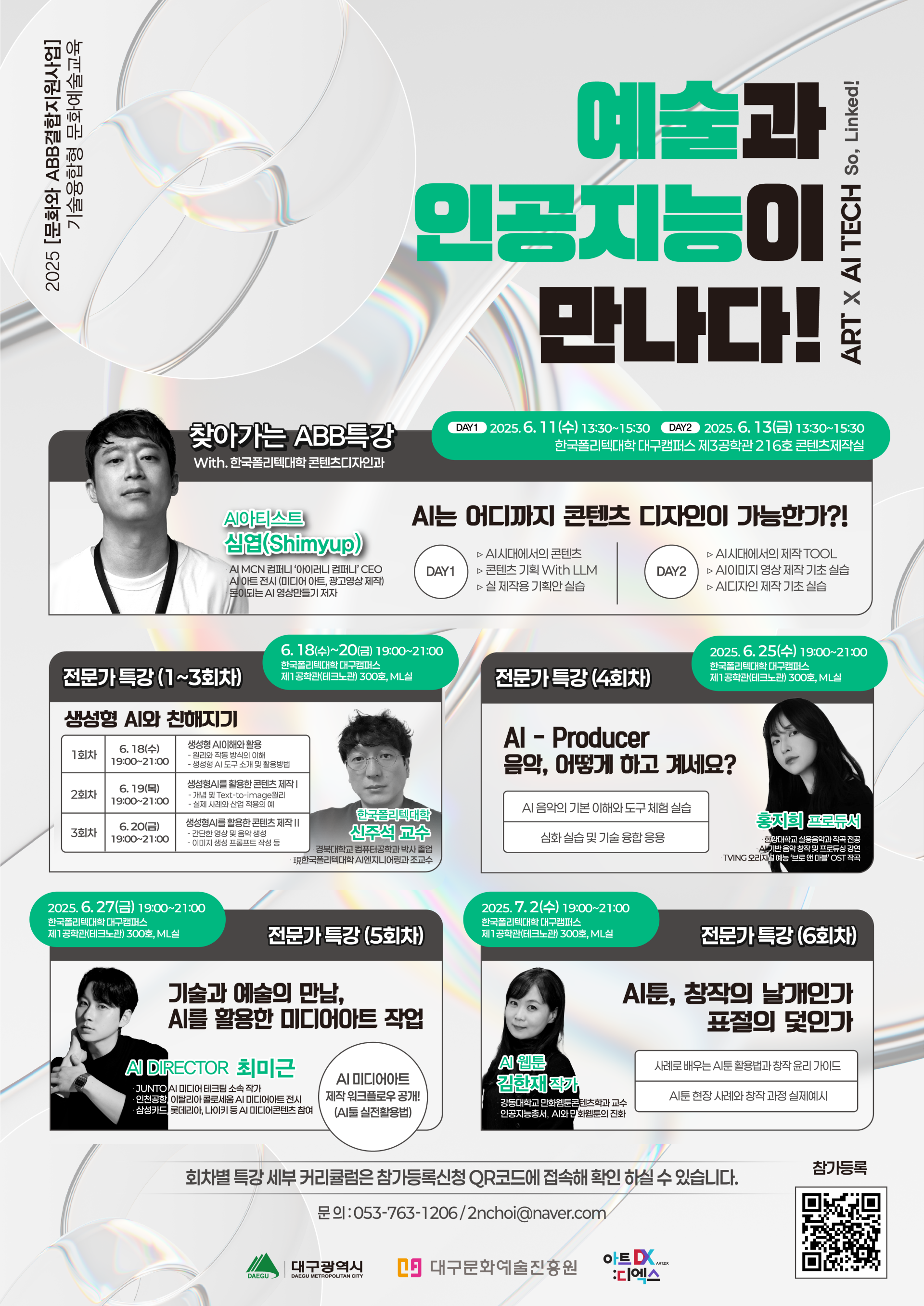 2025년 문화와 ABB결합지원 기술융합형 문화예술교육 (ART X AI TECH) 전문가 특강 참가자를 모집합니다.