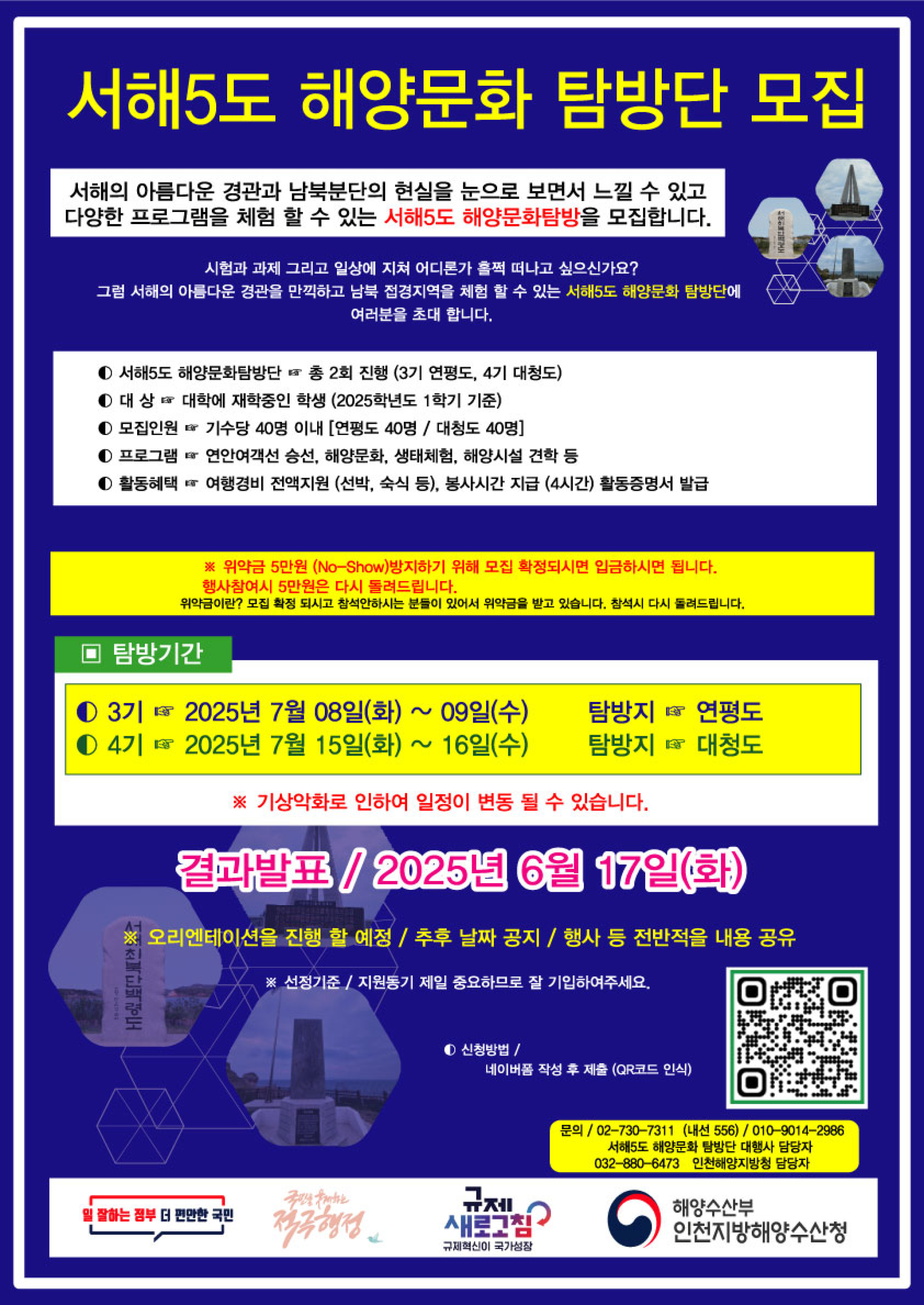 - 인천지방해양수산청 해양수산부에서 주관하는 서해 5도 해양문화탐방단 3기, 4기를 모집합니다.