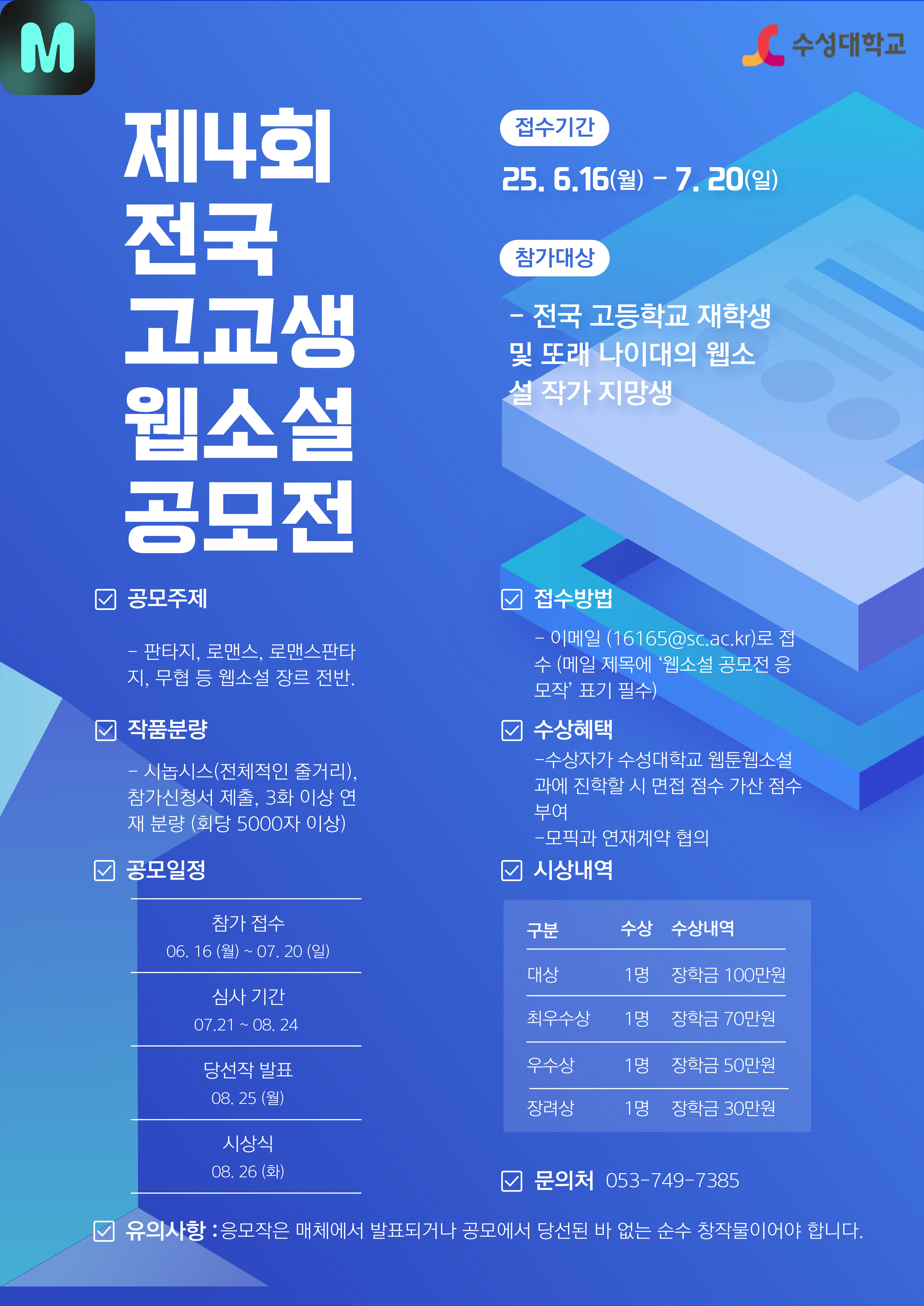 - 접수방법 : 이메일 (16165@sc.ac.kr)로 접수 (메일 제목에 ‘웹소설 공모전 응모작’ 표기 필수)