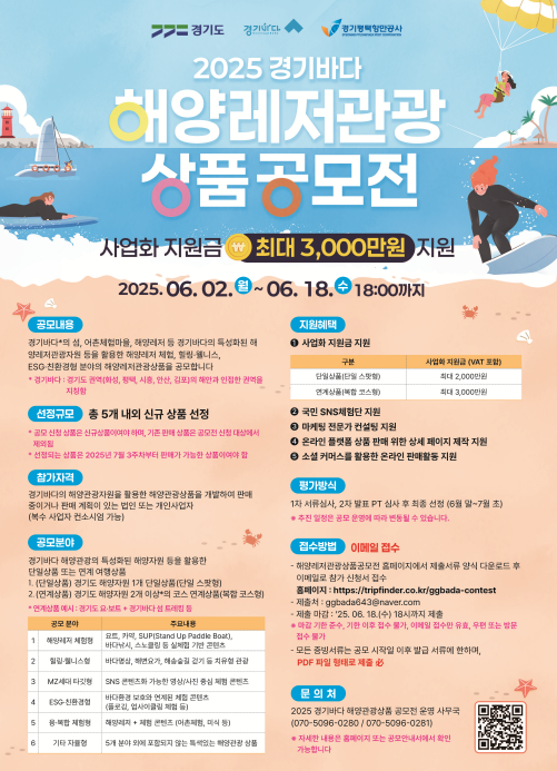 - ☏ 2025 경기바다 우수 해양관광상품 공모전 운영 담당 : 070-5096-0280