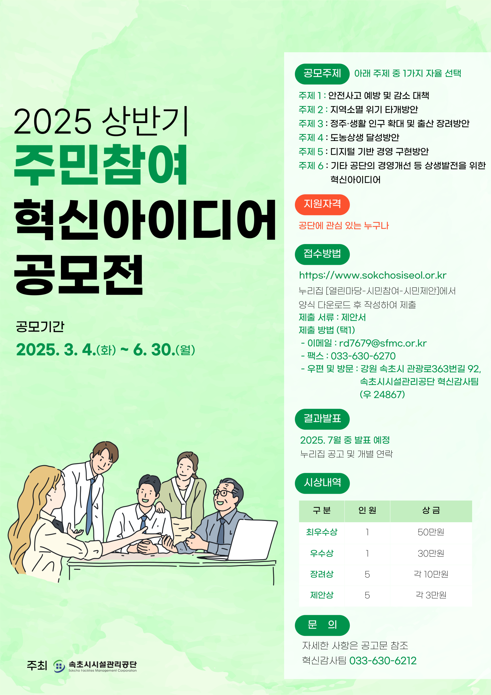 - 우편 및 방문 : 강원 속초시 관광로363번길 92, 속초시시설관리공단 혁신감사팀 (우 24867)