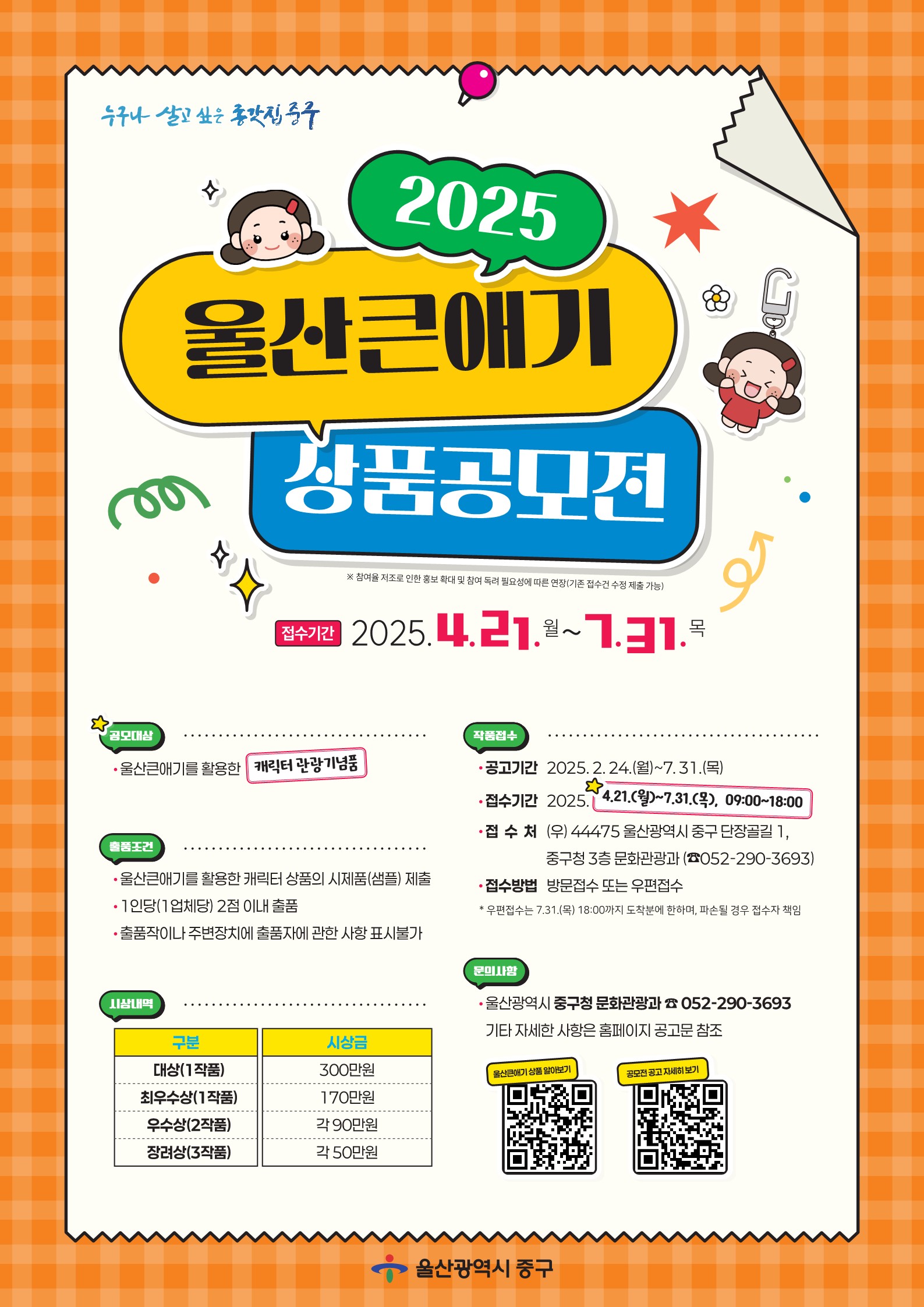 울산 큰애기 상품을 발굴하고자「2025 울산큰애기 상품 공모전」접수기간을 연장하오니많은 관심과 참여 바랍니다.