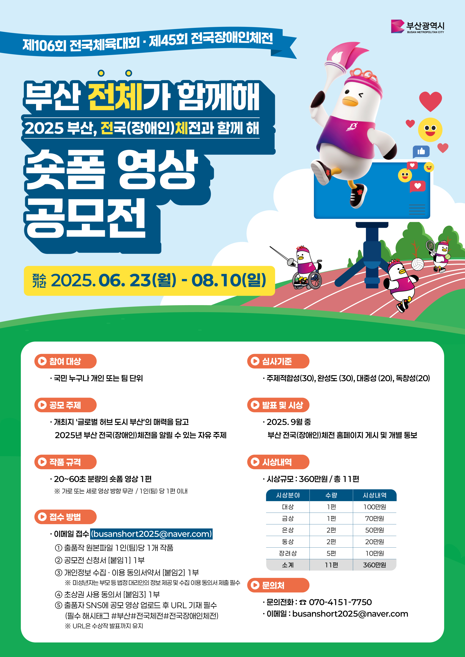 - 공모명 : 부산 전체가 함께해 숏폼 영상 공모전 - 2025 부산 전국(장애인)체전과 함께해