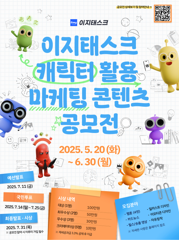 - 새롭게 탄생한 이지태스크 캐릭터를 활용한 창의적인 콘텐츠를 제작하는 공모전입니다.