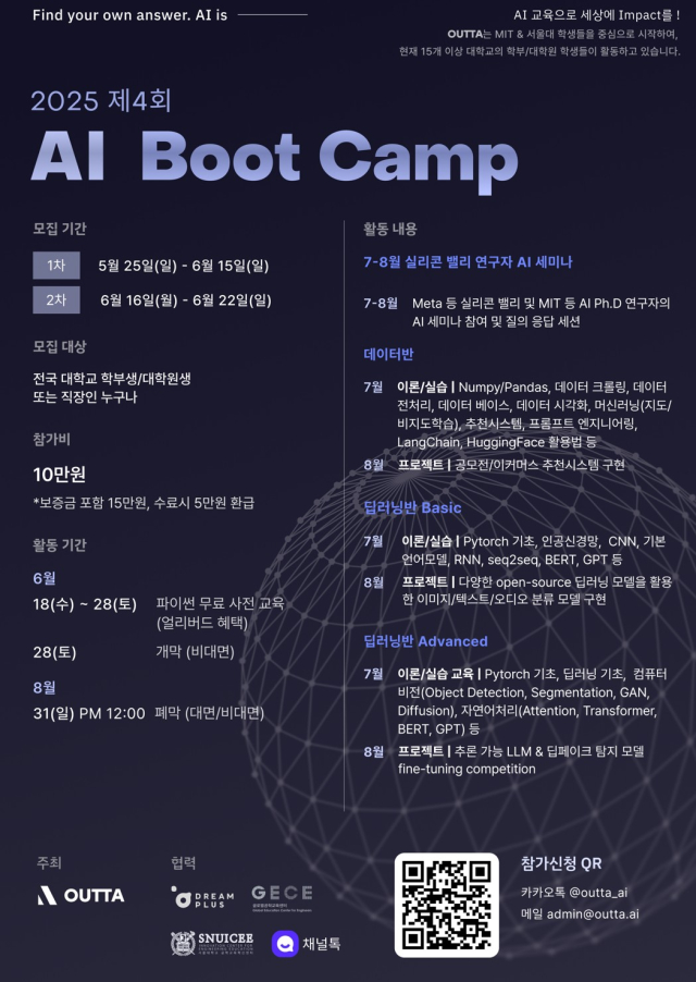 🤖 딥러닝 / 데이터사이언스 배우고 싶은 사람들을 모집합니다! 2025 제 4회 OUTTA AI 부트캠프 🙋