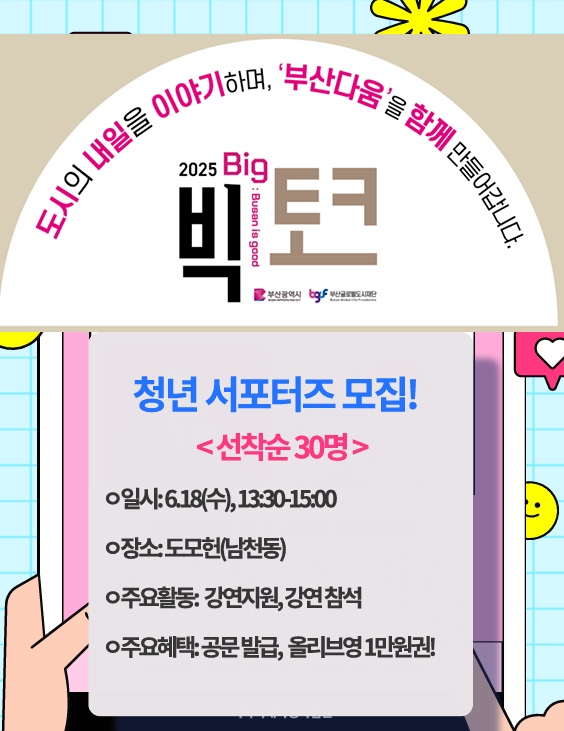 - 안녕하세요! 부산글로벌도시재단은 ‘글로벌허브도시 부산’만의 매력을 조명하는 열린 소통 강연인「2025 빅(Big) 토크」를 개최합니다.