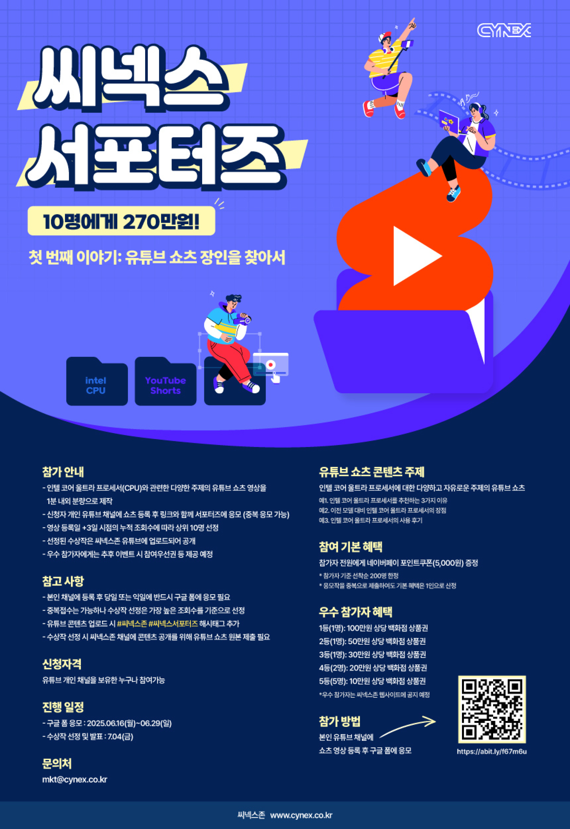 - 신청자 개인 유튜브 채널에 쇼츠 등록 후 링크와 함께 서포터즈에 응모(중복 응모 가능)