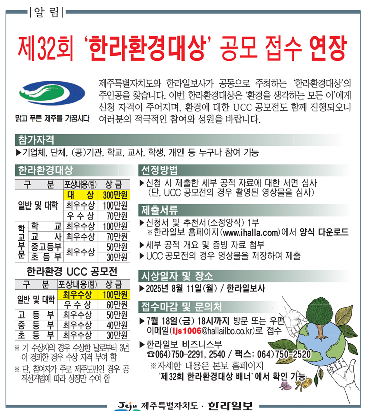 - 접수 및 문의 : ljs1006@hallailbo.co.kr / 064)750-2291, 2540