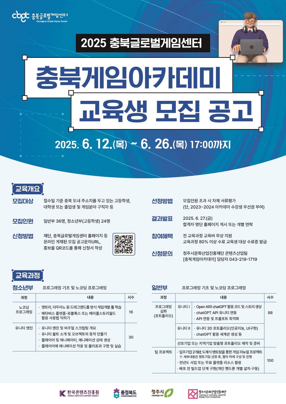 - 모집대상: 접수일 기준 충북 도내 주소지를 두고 있는 고등학생, 대학생, 또는 졸업생 및 게임분야 구직자 등