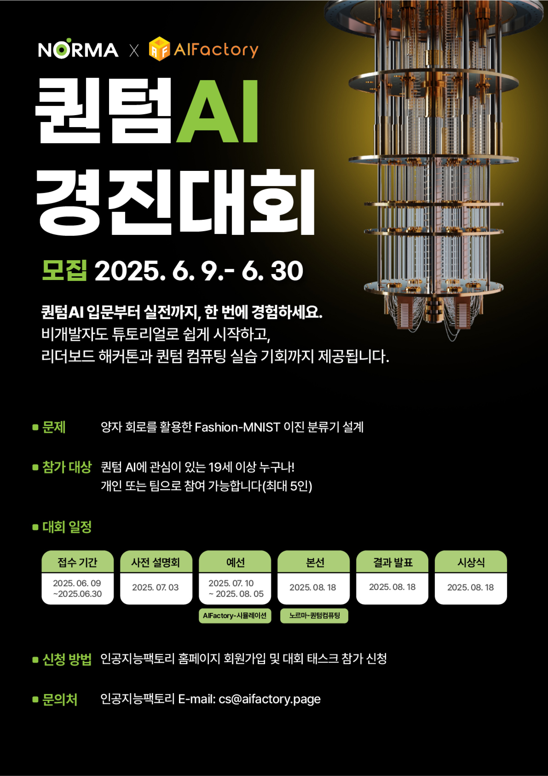 - 비개발자 및 AI개발자 모두가 참여 가능한 실제 양자 컴퓨팅 환경에서 응용 모델을 설계·검증하는 실습 기반 해커톤형 경진대회