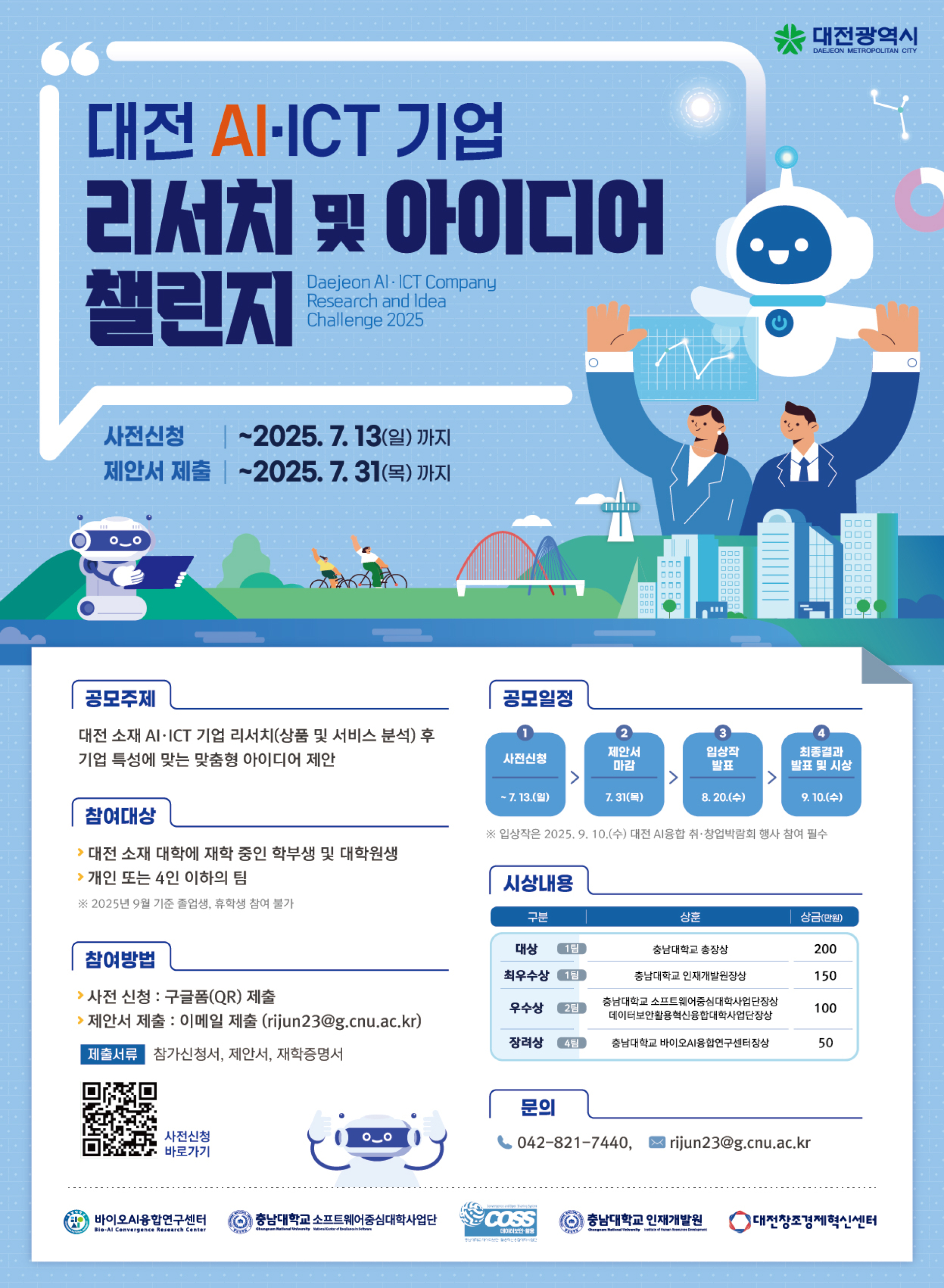 - 제안서 제출 마감 : 2025년 7월 31일(월)까지 rijun23@g.cnu.ac.kr 이메일 제출