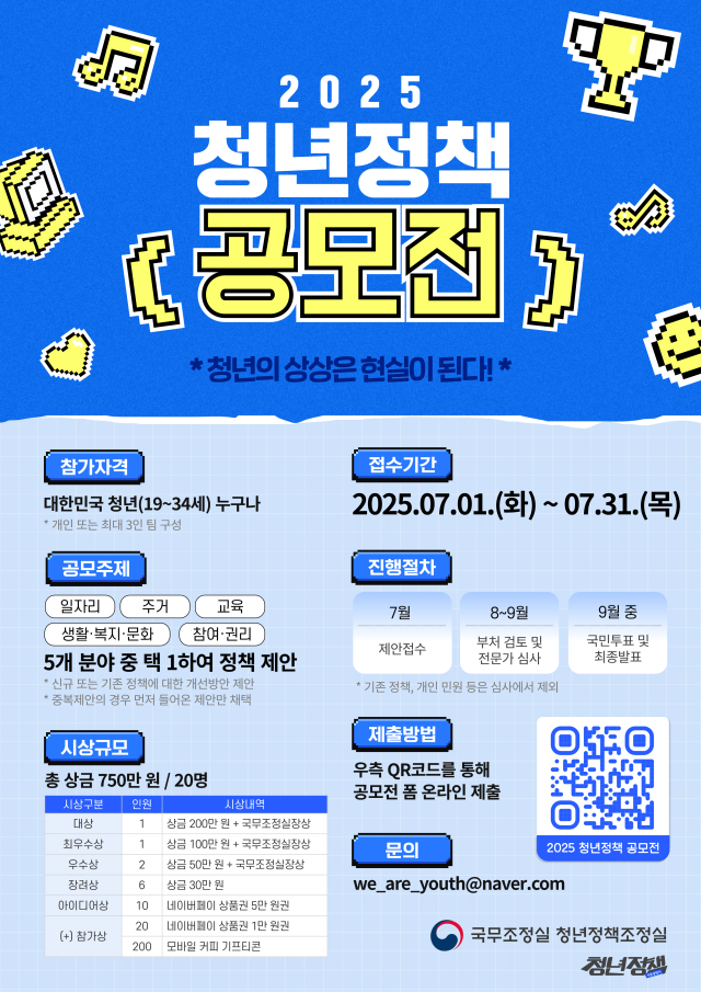 - 2025 청년정책 공모전 <청년의 상상은 현실이 된다>는 청년에게 필요한 정책을 발굴하기 위한 공모전입니다.