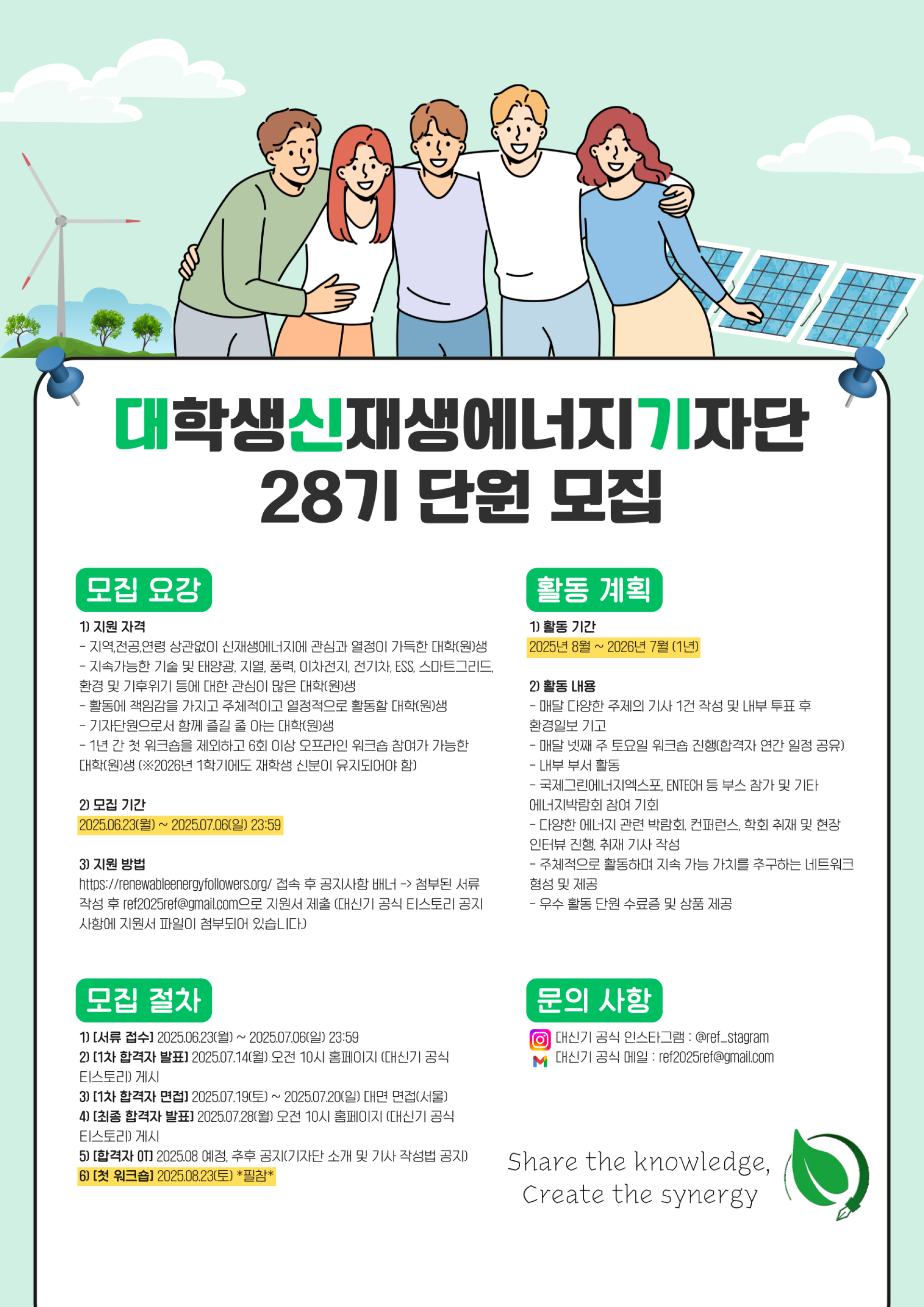 - https://renewableenergyfollowers.org/ 접속 후 공지사항 배너 -> 첨부된 서류 작성 후 ref2025ref@gmail.com으로 지원서 제출