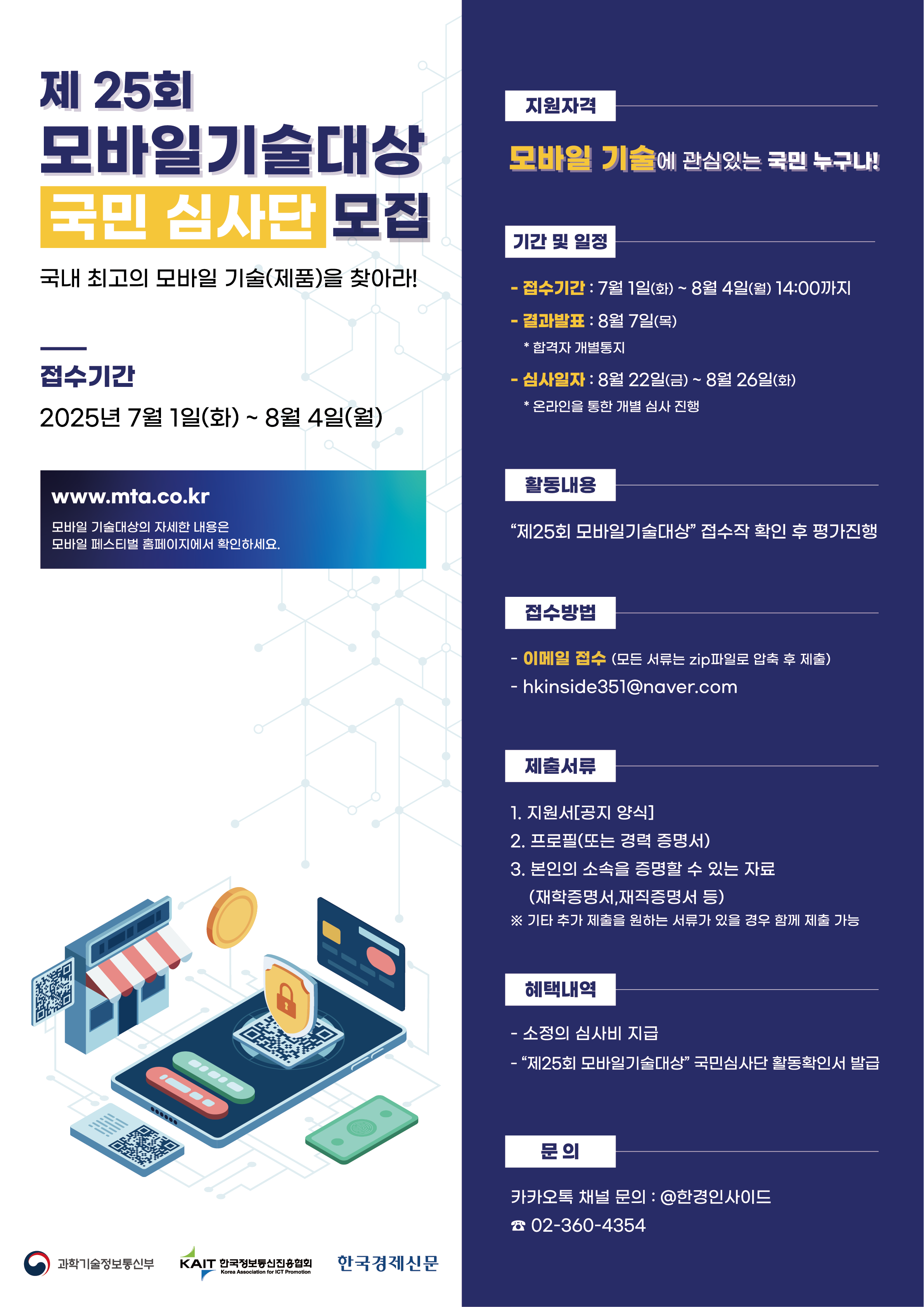 | 혜택 | 소정의 심사비 지급, "제25회 모바일기술대상" 국민심사단 활동확인서 발급 |