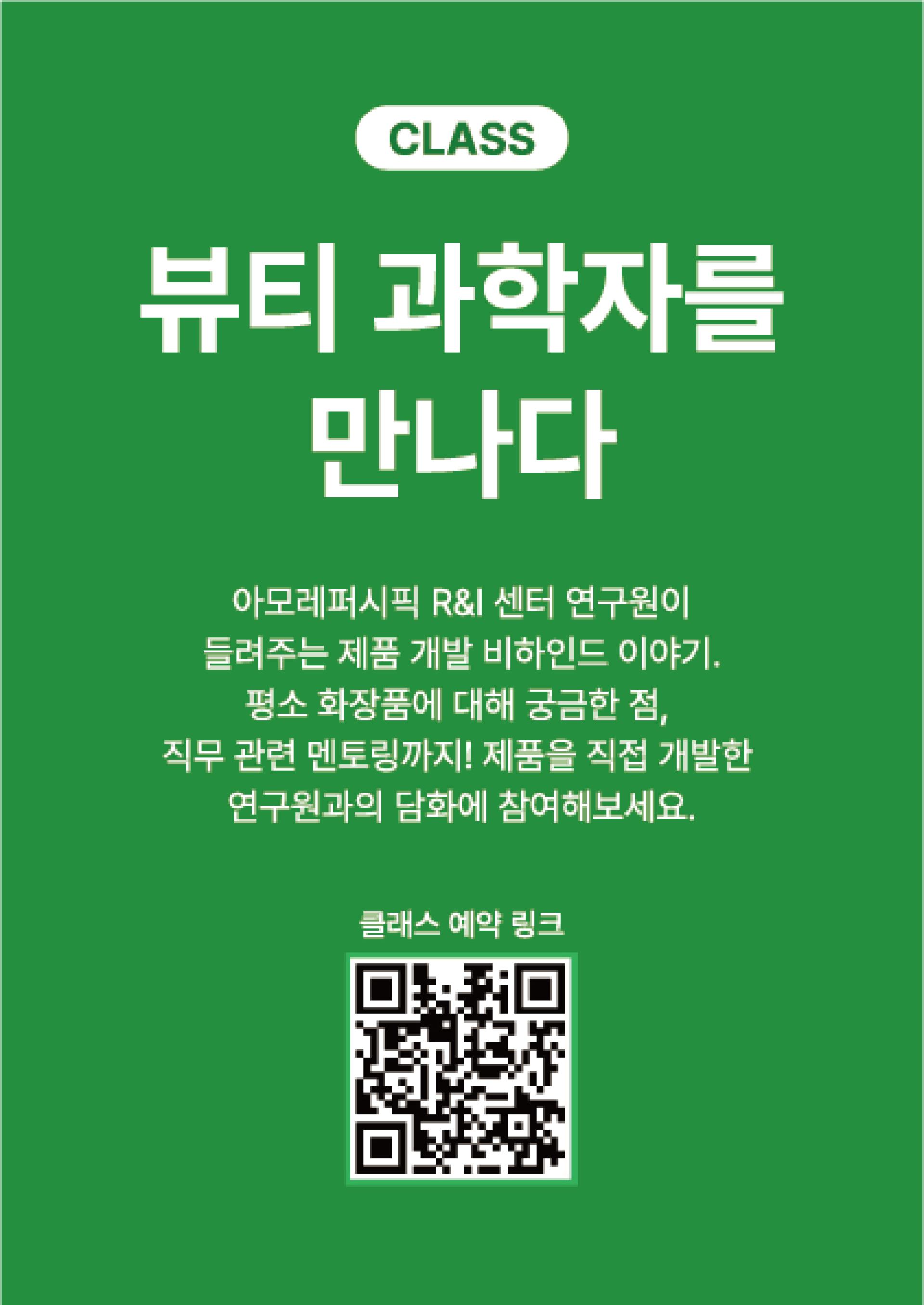 - <뷰티과학자를 만나다> 클래스는 아모레퍼시픽 대표 제품을 개발한 연구원들을 초빙해 진행됩니다.