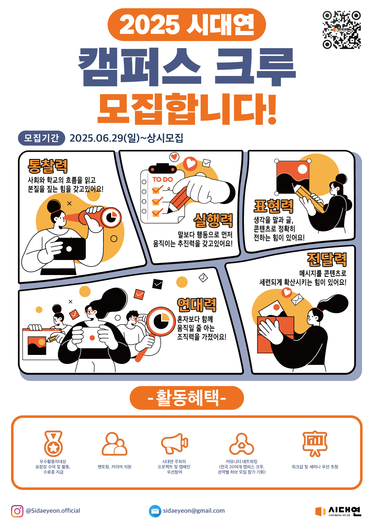 | 혜택 | 우수활동자 대상 표창장 수여 및 활동 수료증 지급, 직능별 멘토링·커리어 네트워킹 지원, 시대연 주최의 프로젝트 및 캠페인 우선 참여 |