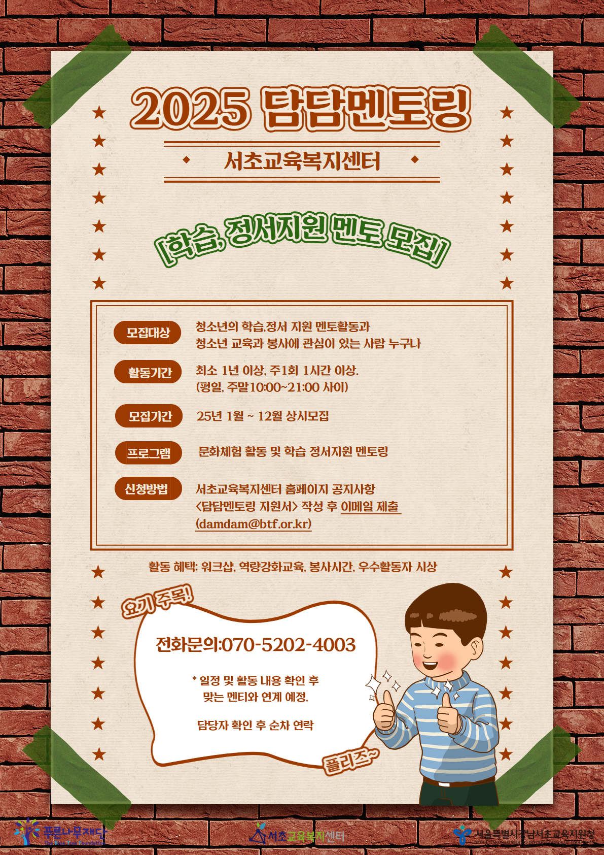 - 서초교육복지센터 홈페이지 공지사항 <담담멘토링 지원서> 작성 후 이메일 제출(damdam@btf.or.kr)