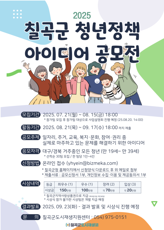 2025 칠곡군 청년정책 아이디어 공모전 참가팀을 다음과 같이 모집·공고합니다.