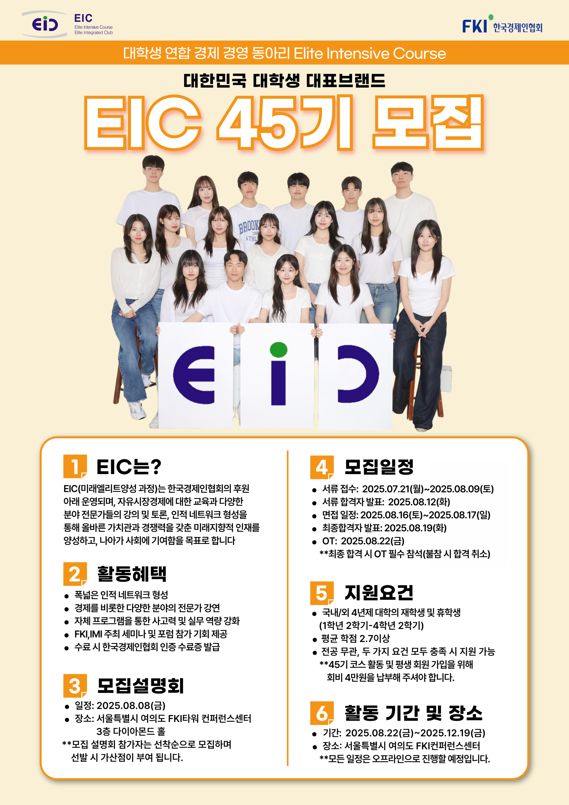 - EIC는 FKI 한국경제인협회의 지원을 받는 대학생 단체이며, 미래 엘리트 양성과정을 이수할 EIC 45기, 100명 내외의 학생을 모집합니다
