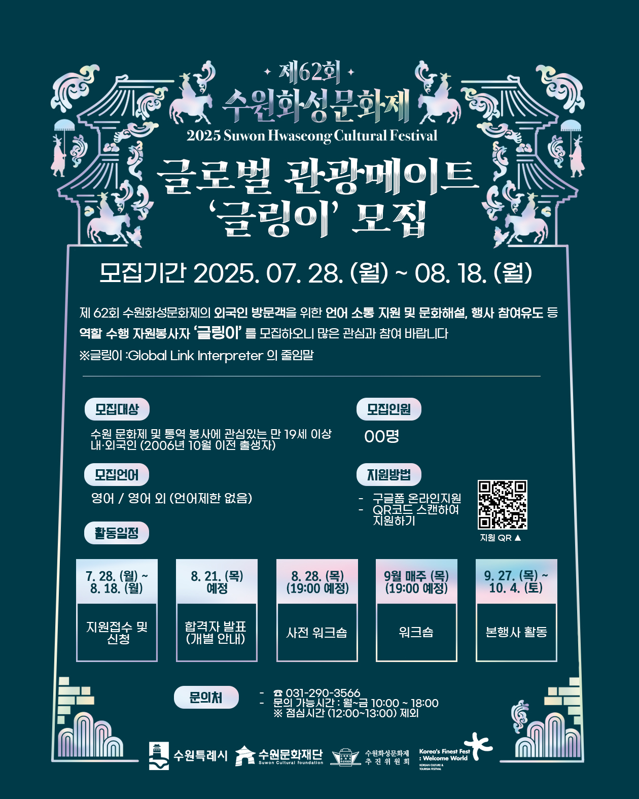 - 모집대상: 수원문화제 및 통역 봉사에 관심 있는 만 19세 이상 내·외국인 (2005년 10월 이전 출생자)