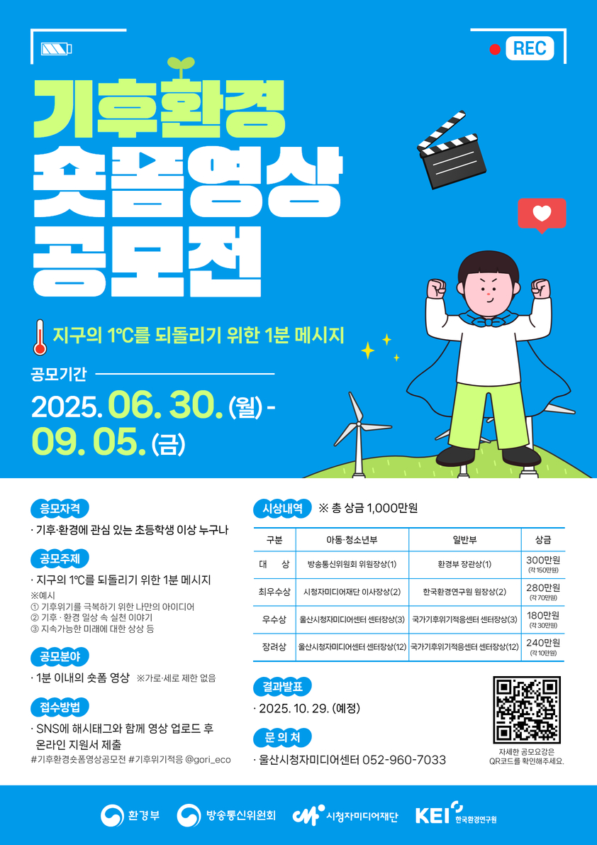 「2025년 기후·환경 숏폼 영상공모전」을 다음과 같이 공고합니다. 기후·환경에 관심 있는 여러분의 많은 참여 바랍니다.