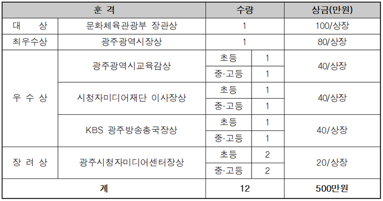 - 문화체육관광부 장관상 등 12점(총 상금 500만원)