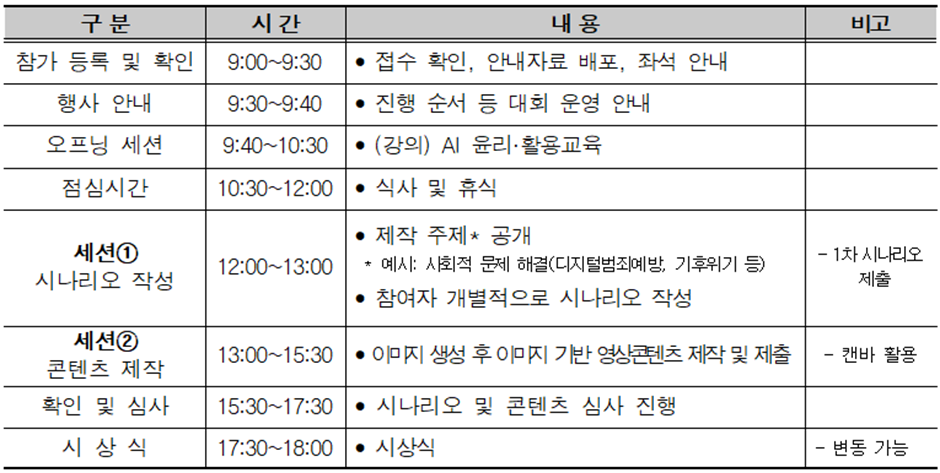 - (대회방식) 주어진 AI 프로그램(캔바(Canva) 등)를 활용, 현장에서 제시된 주제로 1분 미만의 영상 콘텐츠 1편 제작
