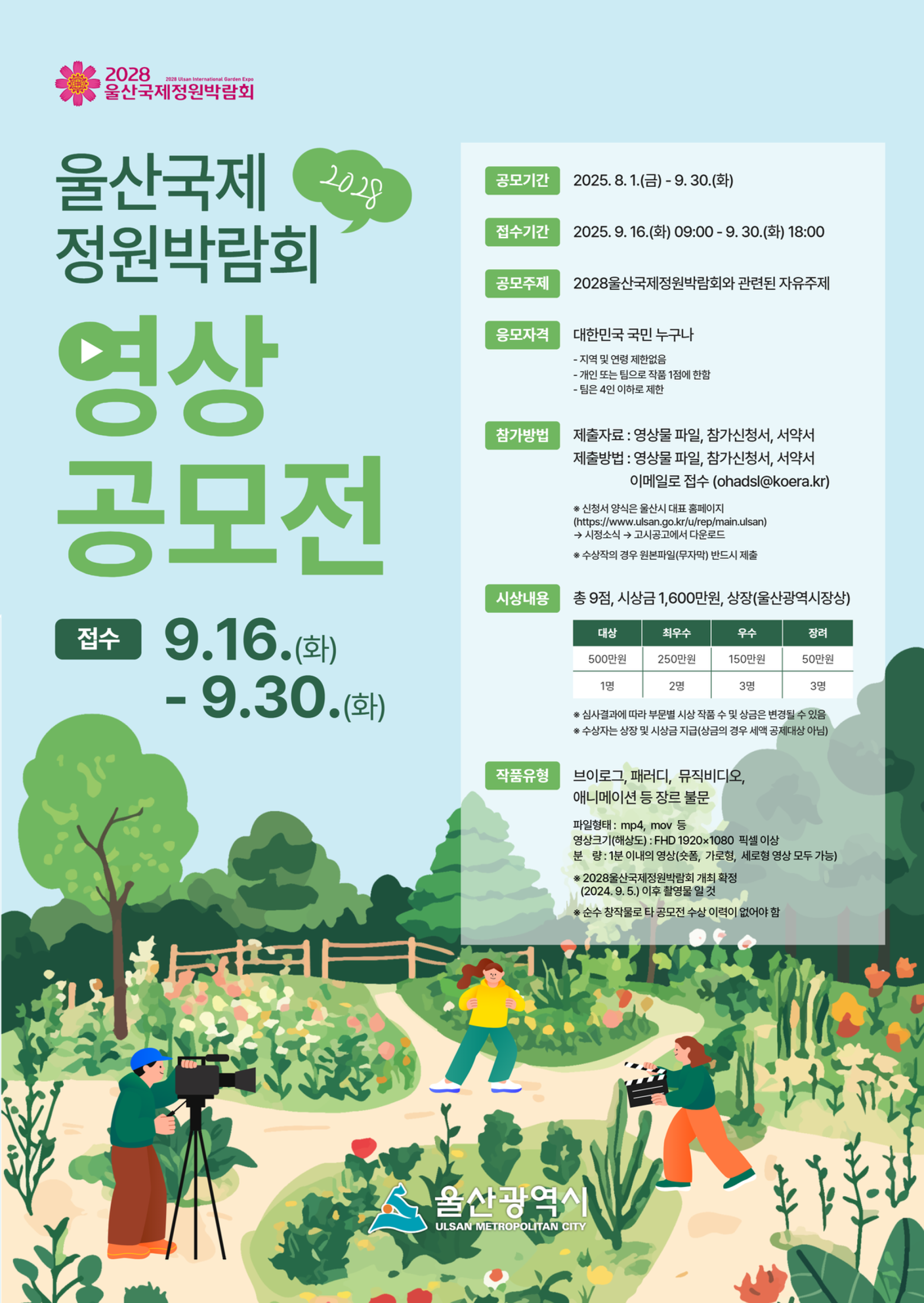 - 2028울산국가정원박람회 성공 개최와 홍보를 위한 참신하고 재치 넘치는 아이디어와 반짝이는 영상을 발굴하고자 공모전 개최