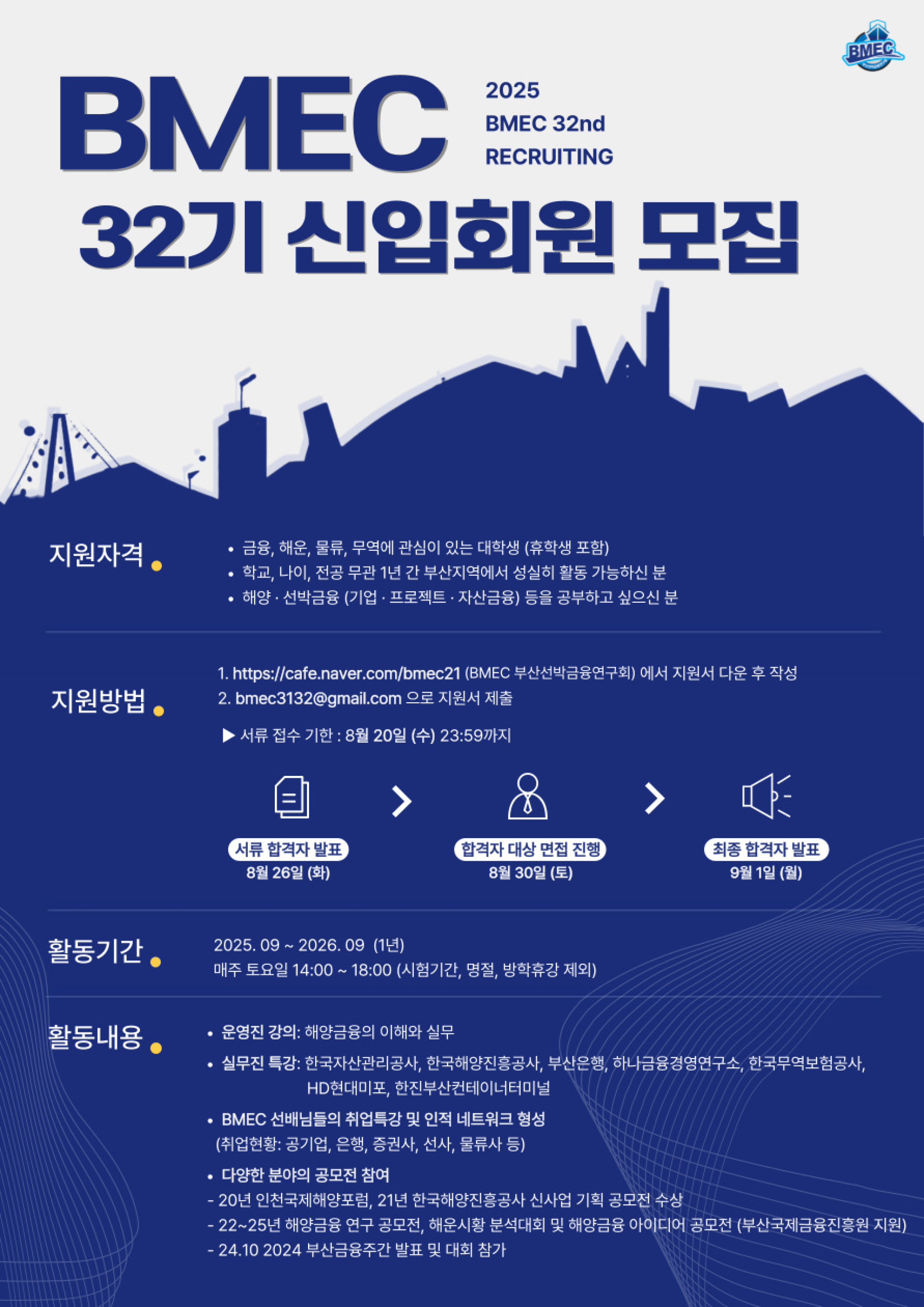 - 안녕하세요, BMEC(부산선박금융연구회)에서 32기 신입회원을 모집합니다.