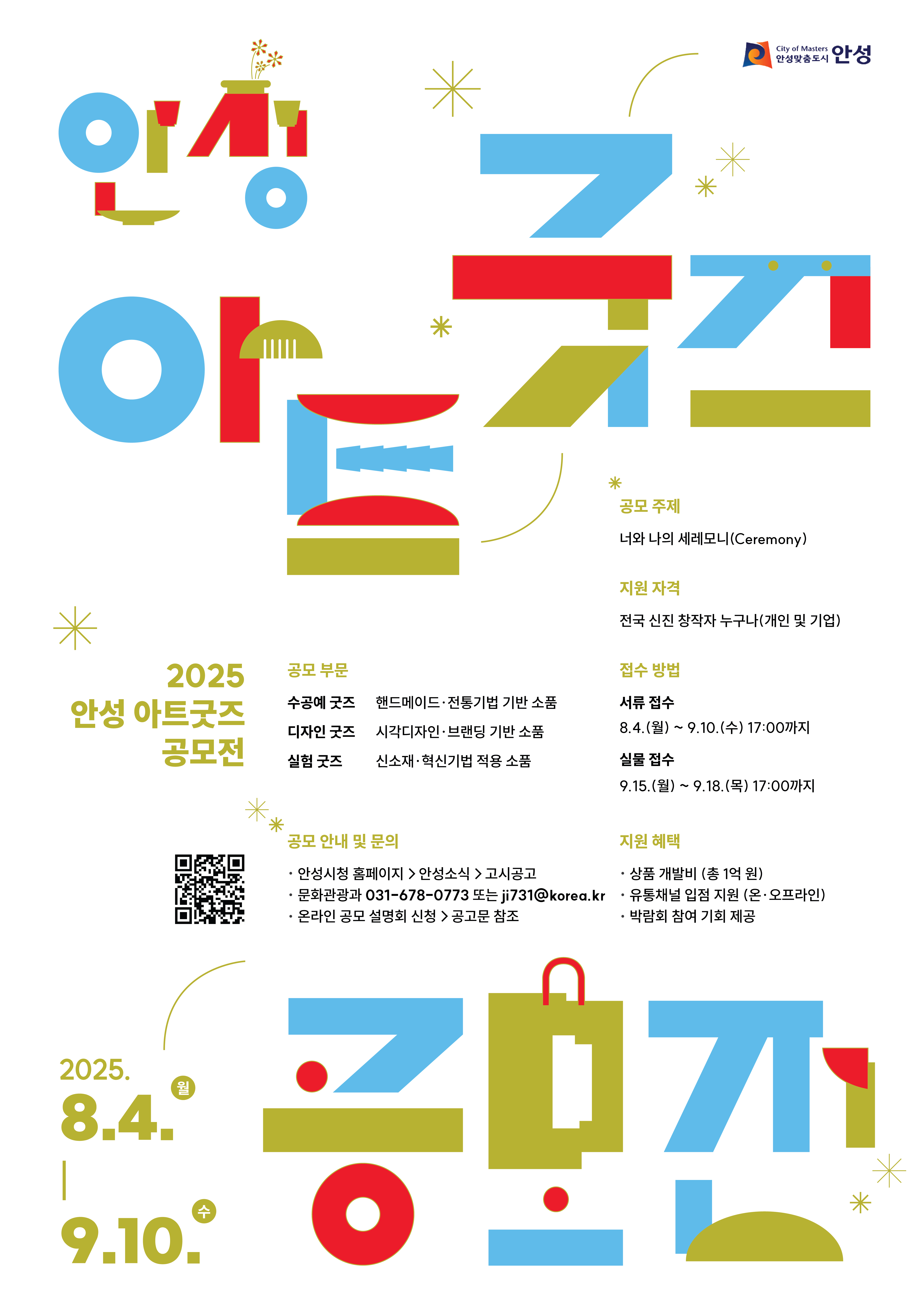 - 전국 신진 공예·디자인 창작자를 대상으로 「2025 안성 아트굿즈 공모전」 을 개최합니다.