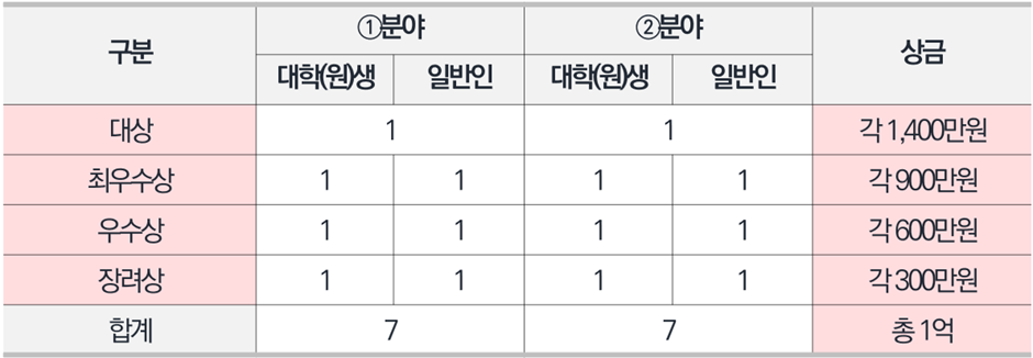■ 시상내역 : 2개 트랙과 2개 분야로 구분하여 시상(대상만 분야별 1개 팀 시상) / 분야별 7개 팀 시상(총 14팀 시상) / 총 상금 1억