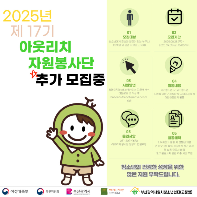 - ☏ 051-303-9670 자원봉사자 모집 담당자에게 연락주십시오.